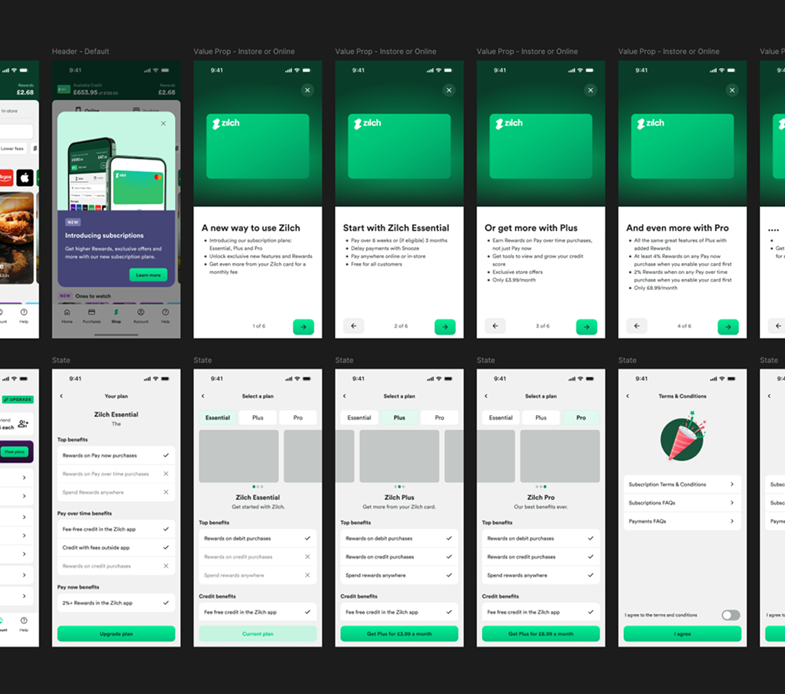 In parallel to the discovery research I was carrying out to validate Zilch Plus, I began working through the screens, flows and touchpoints we needed for launch. I generated a rough set of screens to enable early alignment with product and engineering about what the scope of the project would be.