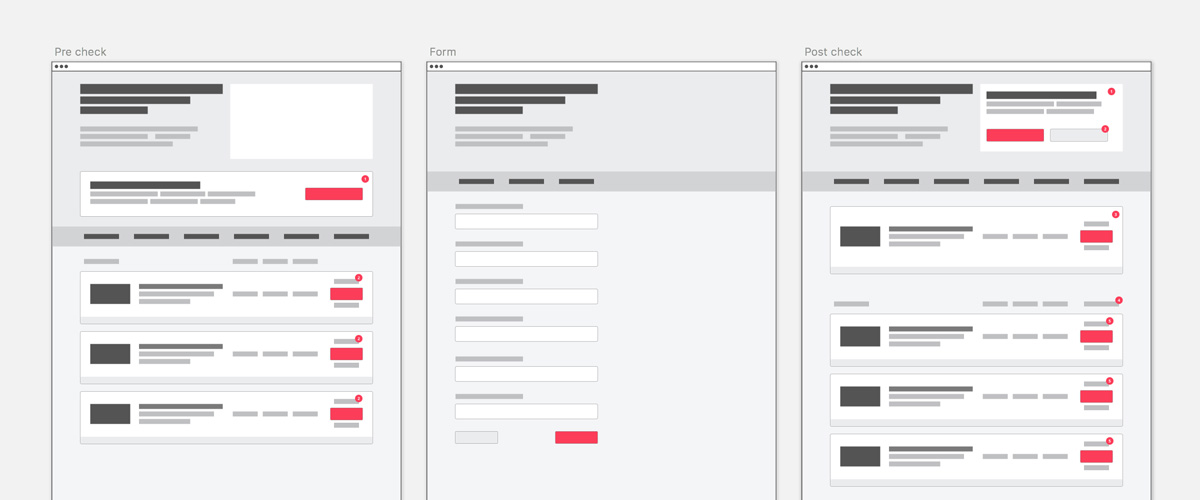 Before we began building, I created a series of low fidelity mockups to help the team understand the flows and data requirements at each step. This started with some basic blocking out of sections so everyone understood how the flow moved from the initial view, through the form to the results.