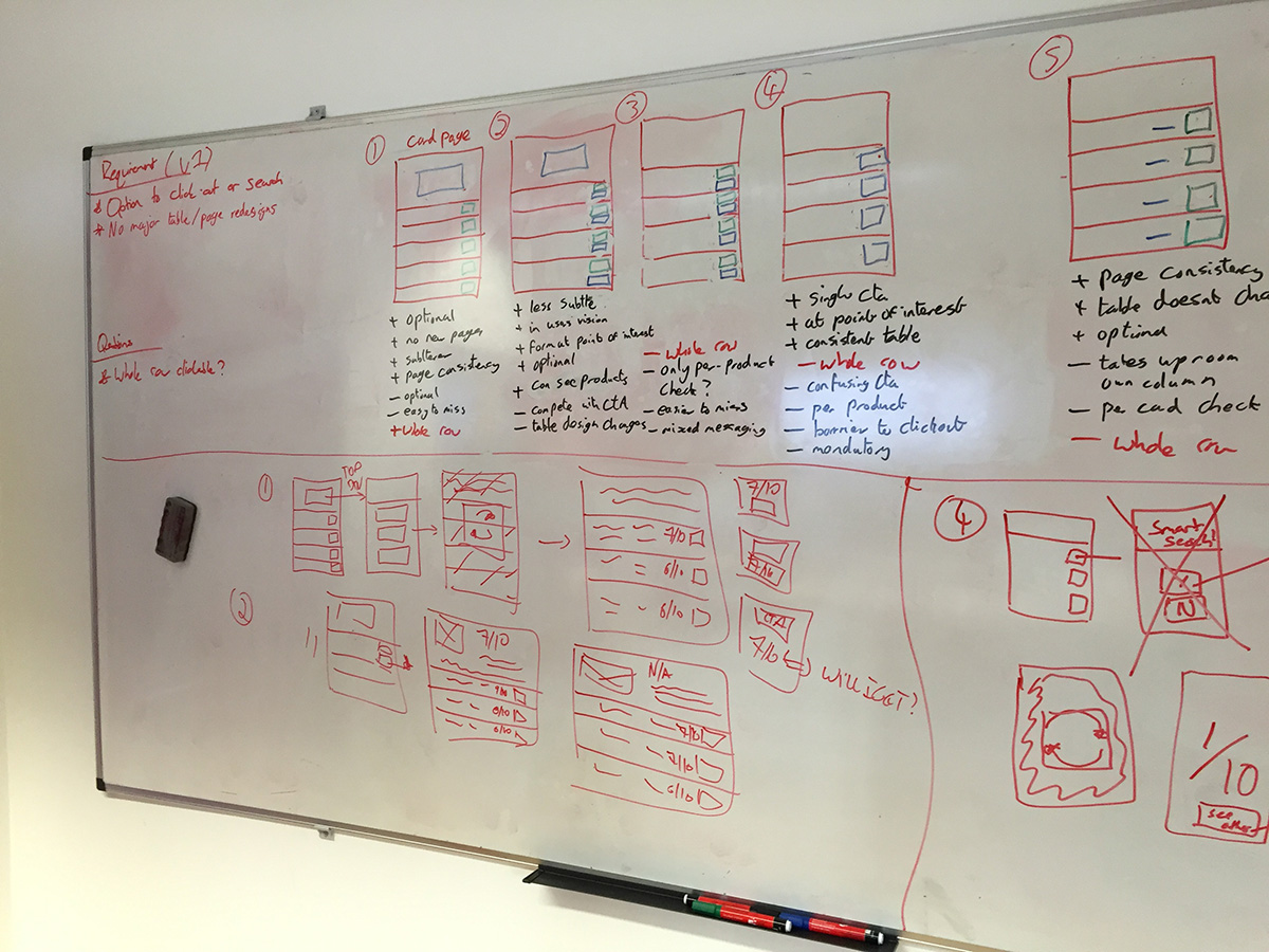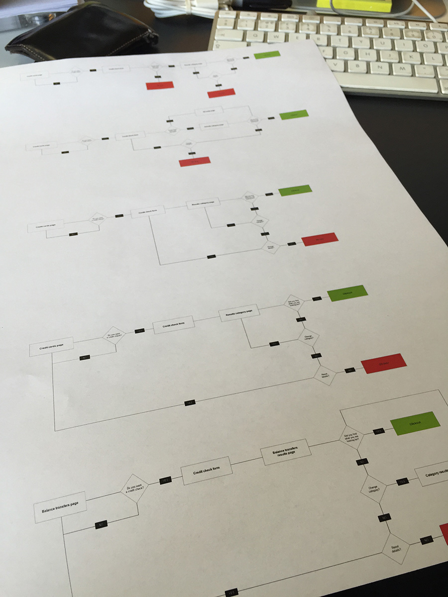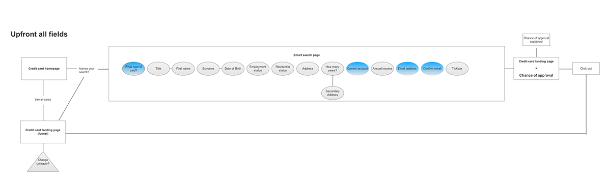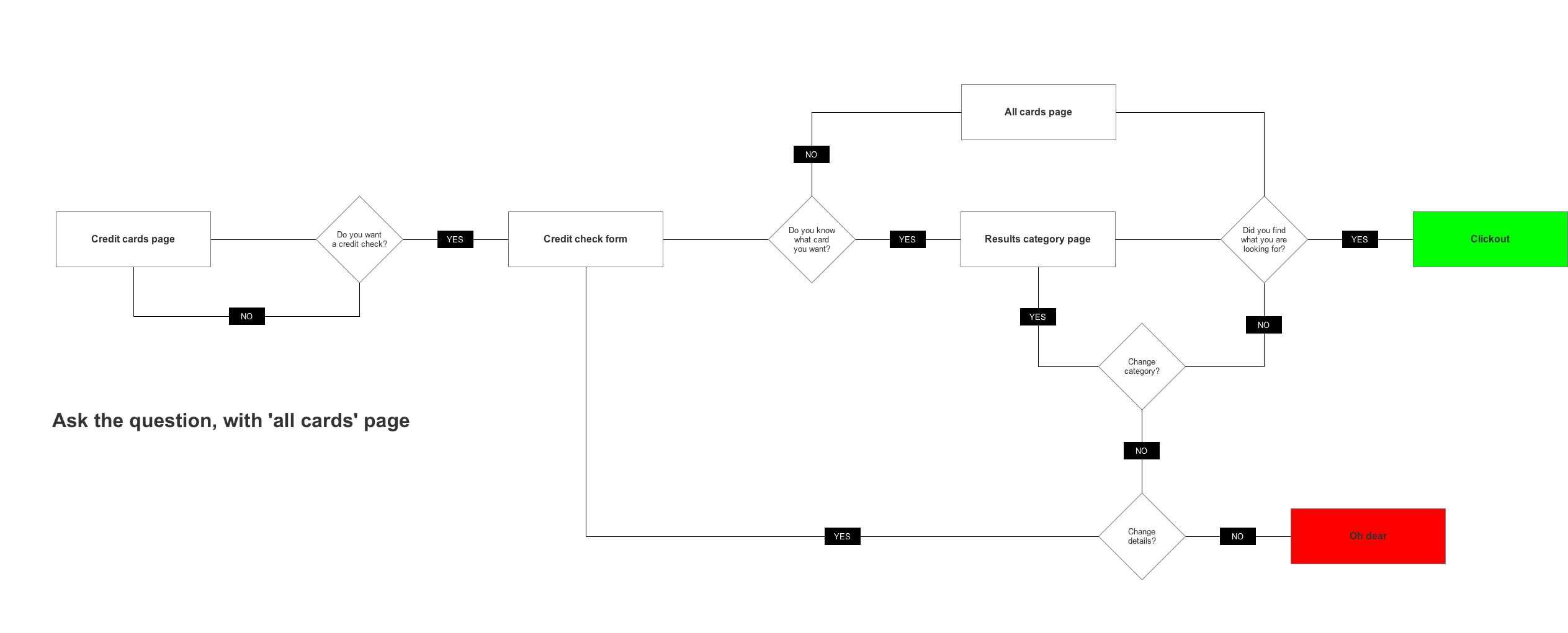 Because credit cards is made up of a main ‘all cards’ page, along with multiple card type pages, we needed to explore how users would get to their results.