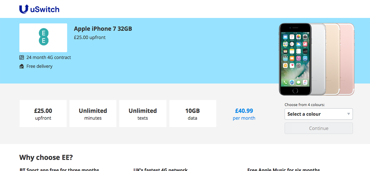 The majority encouraged users to pick a phone colour up front before viewing deals, with a couple allowing users to switch between colours in a table. One other site had the same issue, with multiple colours causing the table to become bloated.