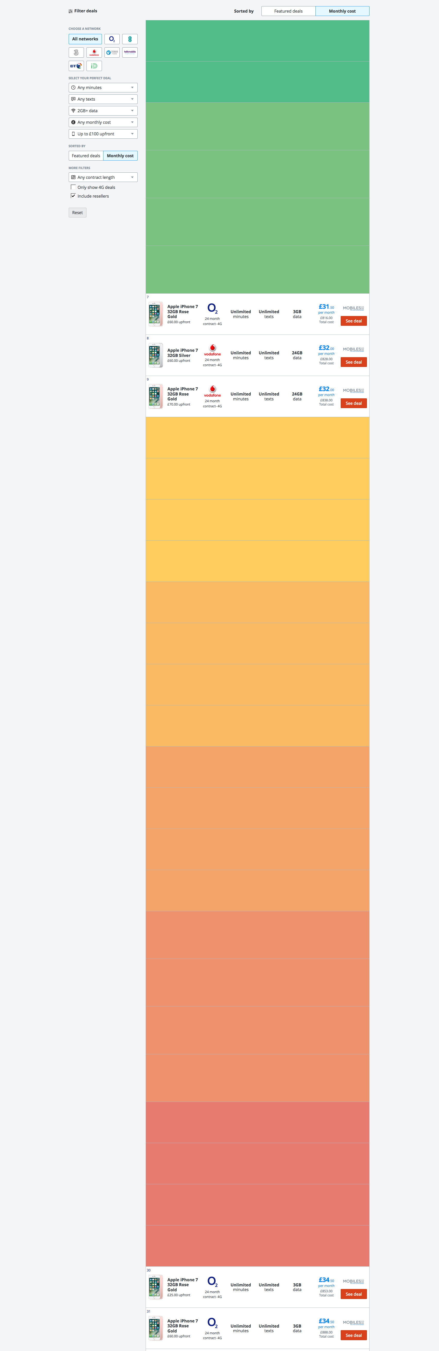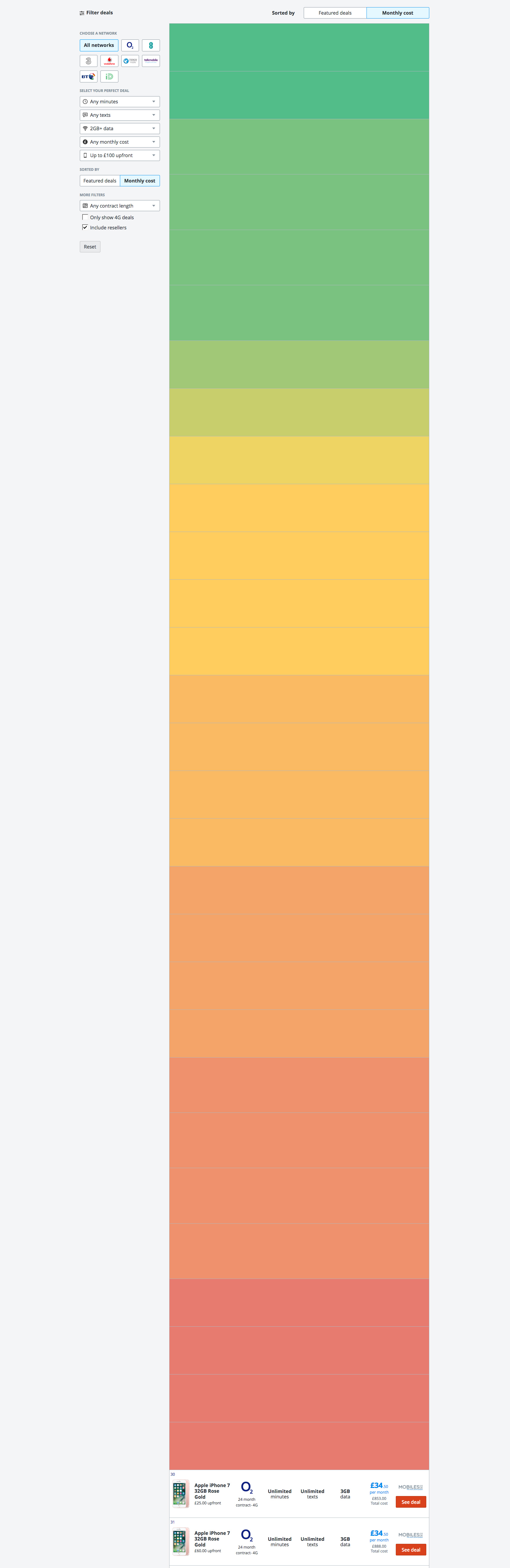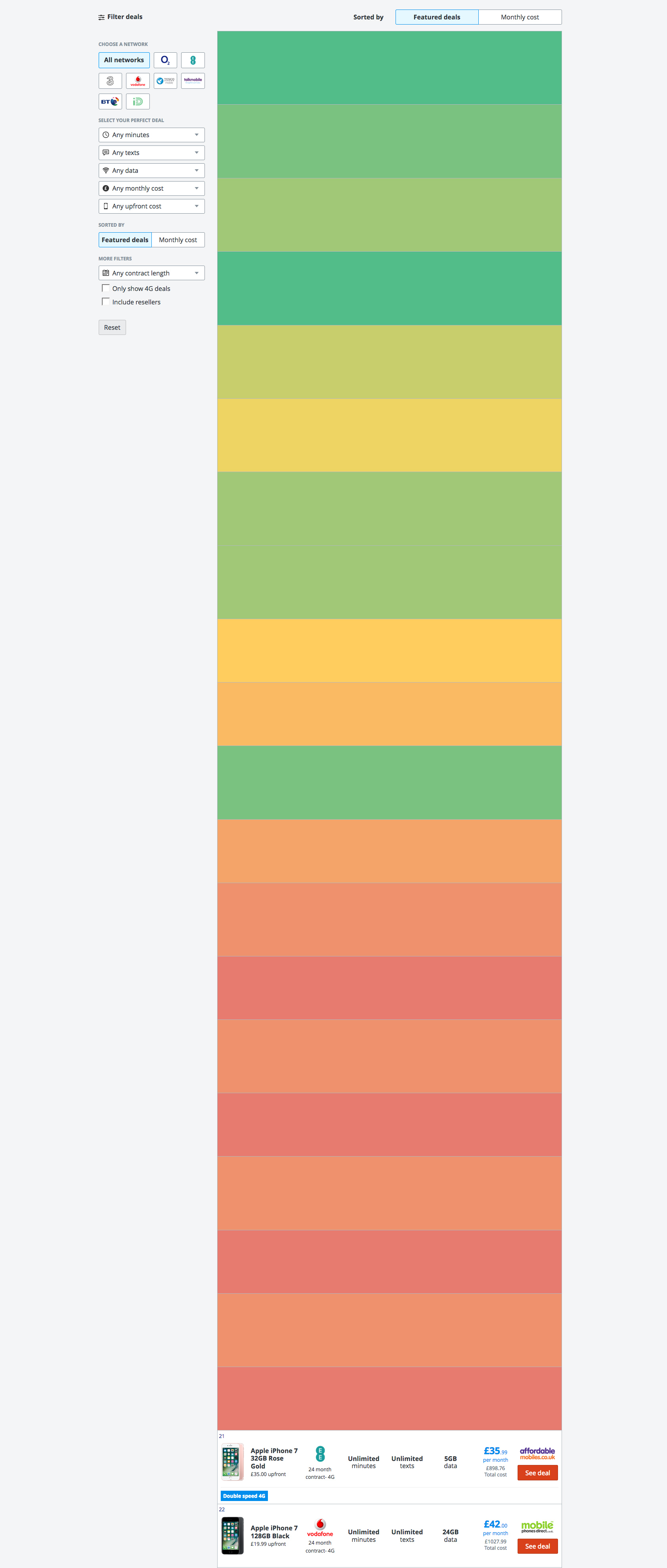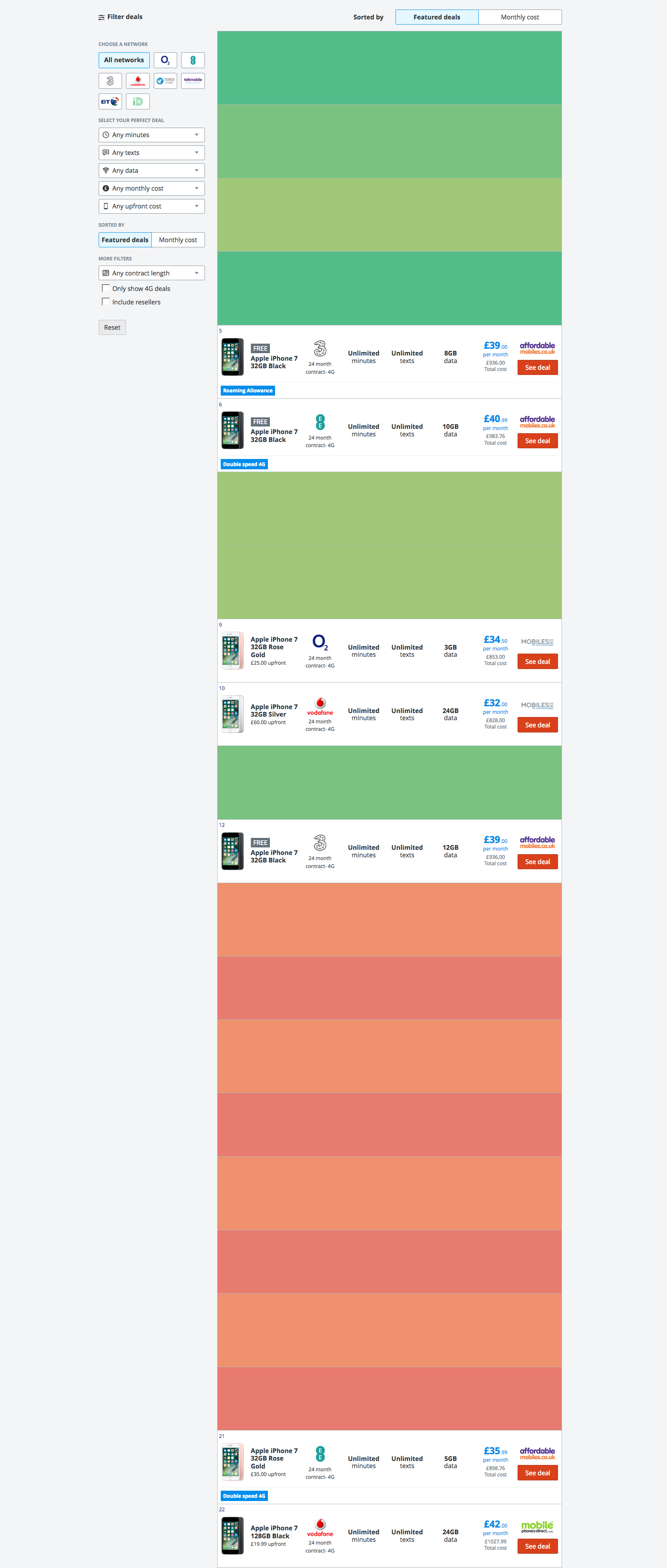 Grouping deals by colour reduced the number of deals we displayed from 90,000 to 40,000. This gave users significantly less work to perform to find their ideal mobile deal.
