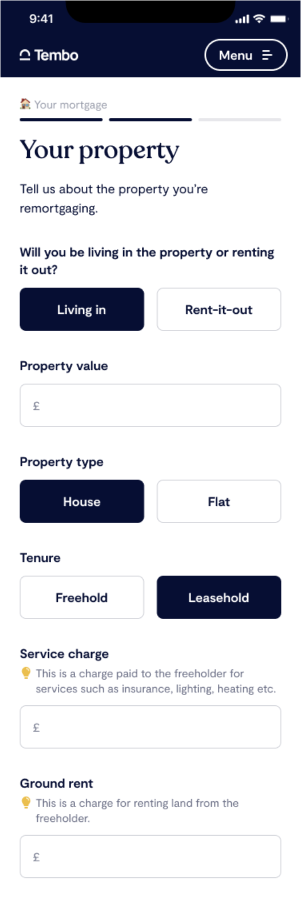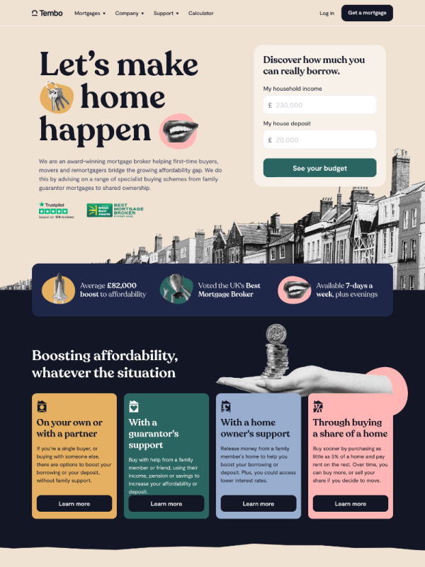 Unlike other mortgage brokers who only offer standard mortgage and remortgages, Tembo offers a wide range of products, from Guarantor mortgages to specialist buying schemes and shared ownership. This enables us to use our decisioning and technology to serve users a wide range of products to find them the best option to buy.